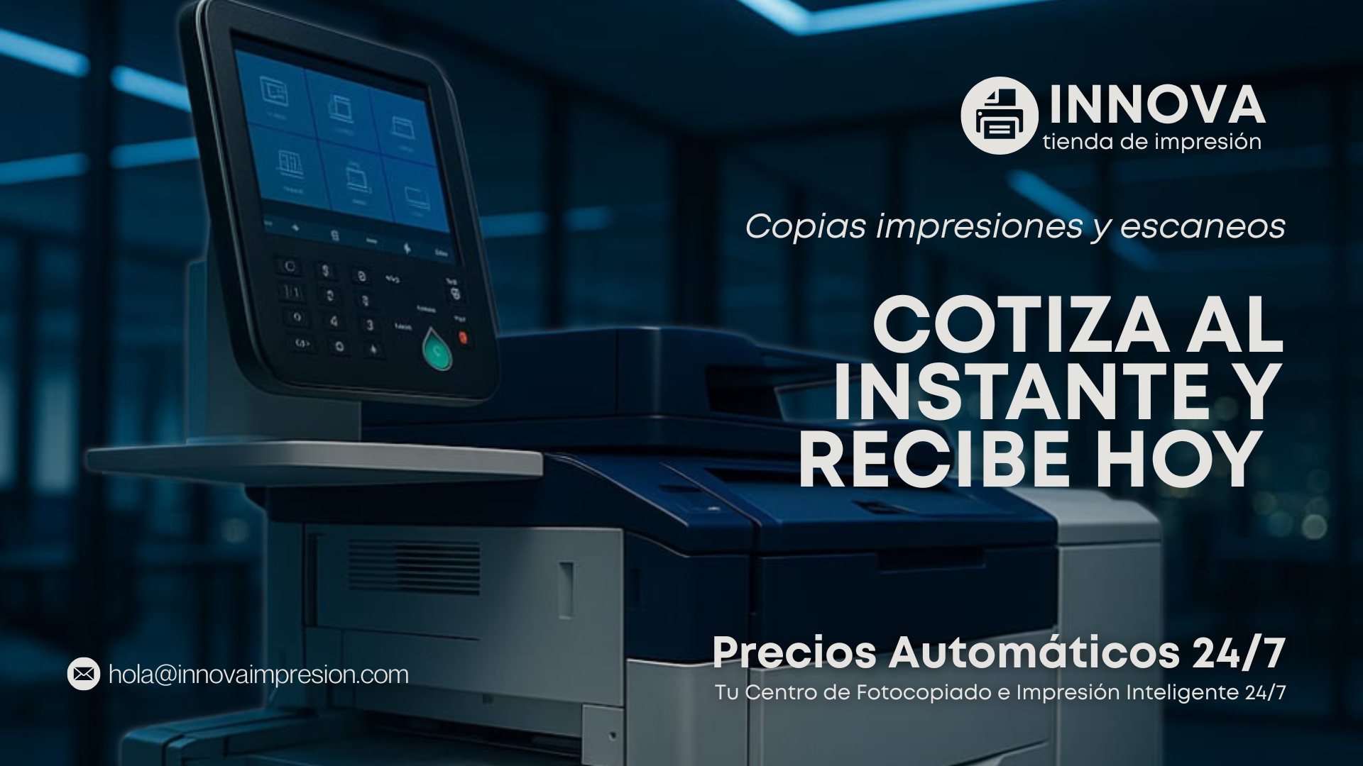 En INNOVA Tienda de Impresión, nuestro sistema de cotización 24/7 es la forma más clara y eficiente de imprimir, copiar, escanear y engargolar documentos con calidad profesional y precios reales por volumen.